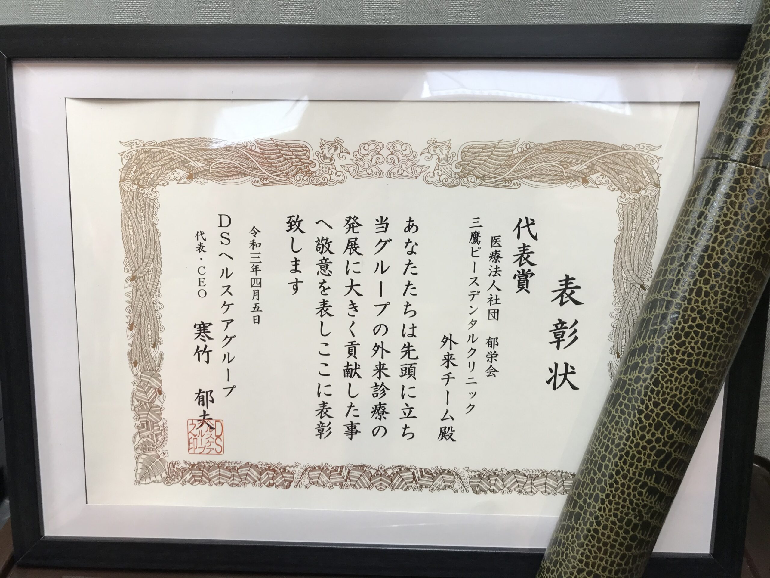 また、上記の3位という結果が評価され、当院が所属しているDSヘルスケアグループの代表より三鷹ピースデンタルクリニックが代表賞を授与されました。